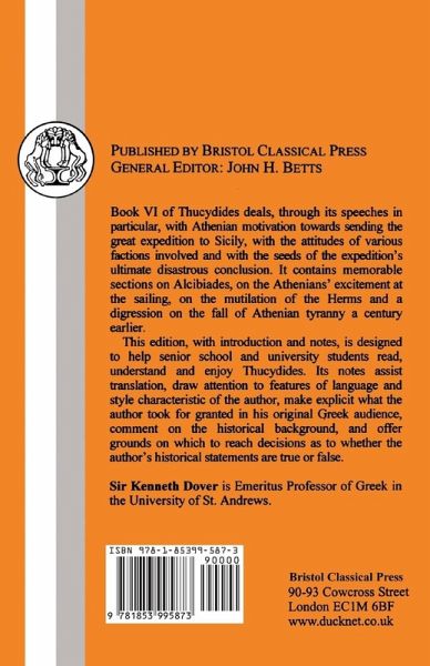 Book VI of Thucydides deals, through its speeches in particular, with Athenian motivation towards sending the great expedition to Sicily, with the attitudes of various factions involved, and with the seeds of the expedition's ultimate disastrous conclusion. It contains memorable sections on Alcibiades, on the Athenians' excitement at the sailing, on the mutilation of the Herms and a digression on the fall of Athenian tyranny a century earlier. This edition, with introduction and notes, is designed to help senior school and university students read, understand and enjoy Thycydides. Its notes aim to assist translation, draw attention to features of language and style characteristic of the author, make explicit what the author took for granted in his original Greek audience, comment on the historical background, and offer grounds on which to reach decisions as to whether the author's historical statements are true or false.