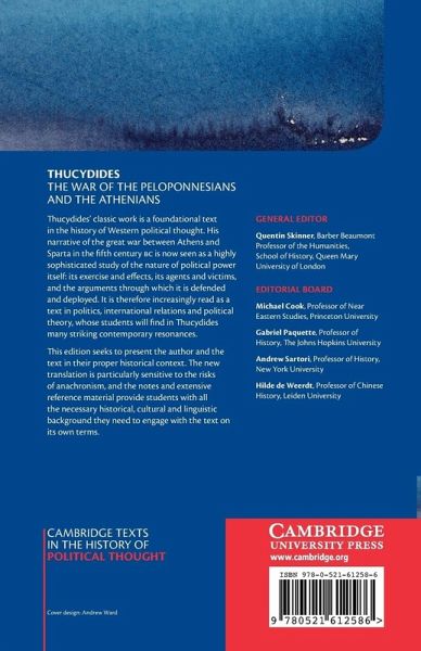 A new translation of Thucydides, a foundational text in the history of Western political thought, with extensive student reference material. Thucydides' classic work is a foundational text in the history of Western political thought. This new translation includes extensive reference material for non-specialists, including maps, glossaries, biographies, chronological charts, notes and an appendix of ancient sources in translation.