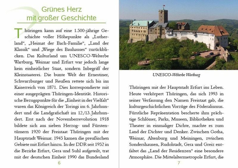 Die Geschichte Thüringens reicht zurück bis zu den "Toringi" der Völkerwanderungszeit, einem der ältesten deutschen Stämme. Über die sagenumwobenen Landgrafen und das kleinstaatliche "Land der Residenzen" kann man ihre Spuren bis hin zum heutigen Freistaat verfolgen. Dabei erschließt sich die Bedeutung Thüringens als einzigartig dichtes Kulturland um UNESCO-Welterbe Wartburg, Weimar und Erfurt, als "Lutherland", "Heimat der Bache", "Land der Klassik" und "Wiege des Bauhauses". All dies ist eingebettet in eine reizvolle Natur. Deshalb wird Thüringen seit Ende des 19. Jahrhunderts auch "Grünes Herz Deutschlands" genannt. Schöpfer der Marke ist Wanderschriftsteller August Trinius. In jüngster Zeit wurde das seit Generationen emotional fest verwurzelte Motto der Thüringer auch vom Freistaat wieder aufgegriffen. Thüringer Wald mit Rennsteig, Inselsberg und Oberhof, Thüringer Schiefergebirge und Saalestauseen, Weltnaturerbe Hainich, Eichsfeld, Südharz, Kyffhäuser, Hainleite, Thüringer Holzland und Rhön - überall verbindet sich das Grüne Herz mit großer Geschichte