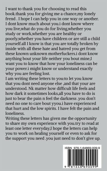 I want to thank you for choosing to read this book.thank you for giving me a chance,my lonely frend . I hope I can help you in one way or another. I dont know much about you.i dont know where you live,what do you do for living,whether you study or work,whether you are healthy or poorly,whether you have children or are still a child yourself.all I know is that you are totally broken by inside with all these hate and hatred you get from these known unknown motherfuckers.i dont know anything bout your life neither you bout mine,I want you to know that how your loneliness can be your power.i might know or understand exactly why you are feeling lost. I am writing these letters to you:to let you know that you dont need anyone else ,and that your are understood. Nk matter how difficult life feels and how dark it sometimes looks,all you have to do is just to bear the pain n feel the darkness .you don’t need no one to care bout yyou.i have experienced that hurt and the low spirits. I have felt the pain and loneliness. Writing these letters has given me the opportunity to share my own experience with you.try to read at least one letter everyday,I hope the letters can help you to work on healing yourself or even to ask for the support you need .you just need to don’t give up.