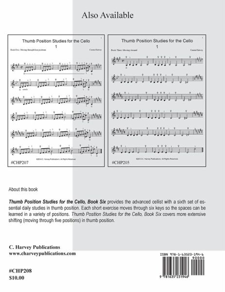 Thumb Position Studies for the Cello, Book Six provides the advanced cellist with a sixth set of essential daily studies in thumb position. Each short exercise moves through six keys so the spaces can be learned in a variety of positions. Thumb Position Studies for the Cello, Book Six covers more extensive shifting (moving through five positions) in thumb position.