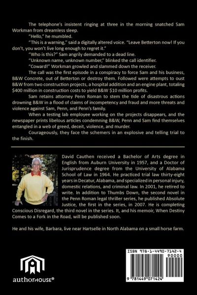 The telephone's insistent ringing at three in the morning snatched Sam Workman from dreamless sleep. "Hello," he mumbled. "This is a warning," said a digitally altered voice. "Leave Betterton now! If you don't, you won't live long enough to regret it." "Who is this?" Sam angrily demanded to a dead line. "Unknown name, unknown number," blinked the call identifier. "Coward!" Workman growled and slammed down the receiver. The call was the first episode in a conspiracy to force Sam and his business, B&W Concrete, out of Betterton or destroy them. Followed were attempts to oust B&W from two construction projects, a hospital addition and an engine plant, totaling $400 million in construction costs to yield B&W $10 million profits. Sam retains attorney Penn Roman to stem the tide of disastrous actions drowning B&W in a flood of claims of incompetency and fraud and more threats and violence against Sam, Penn, and Penn's family. When a testing lab employee working on the projects disappears, and the newspaper prints libelous articles condemning B&W, Penn and Sam find themselves entangled in a web of greed, deceit, violence, and murder. Courageously, they face the schemers in an explosive and telling trial to the finish.