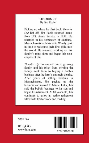 Picking up where his first book Thumbs Out left off, Jim Poole returned home from U.S. Army Service in 1958. He resettled in his hometown of Sudbury, Massachusetts with his wife, Wendy just in time to welcome their first child into the world. He resumed working on his family's mink farm and began his next chapter of life. As his family grew, he assumed ownership of the mink farm. Thumbs Up documents Jim's pivot from owning the mink farm to buying a bobbin business after the farm's untimely demise. After years of selling bobbins in Massachusetts, Jim packed up the bobbin business and moved to Maine. Later Jim sold the bobbin business to his son and continues to enjoy retirement in his rural community.