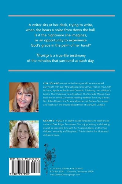 A writer sits at her desk, trying to write, when she hears a noise from down the hall. Is it the nightmare she imagines, or an opportunity to experience God's grace in the palm of her hand? Thump is a true-life testimony of the miracles that surround us each day. Written by international playwright and children's author, Lisa Soland, this picture book is sure to delight and inspire children of all ages. Lisa Soland (author) comes to the literary world as a renowned playwright with over 40 publications by Samuel French, Inc, Smith & Kraus, Applause Books and Dramatic Publishing. Her children's books, The Christmas Tree Angel and The Unmade Moose, have become an annual Christmas reading tradition for many families. Ms. Soland lives in the Smoky Mountains of Eastern Tennessee and teaches in the theatre department at Maryville College. Karah D. Tull (illustrator) is an eighth grade language arts teacher and native of Oak Ridge, Tennessee. She enjoys writing and drawing, as well as spending time with her husband, Dave, and her two children, Kennedy and Shepherd. This is Karah's first illustrated children's book.