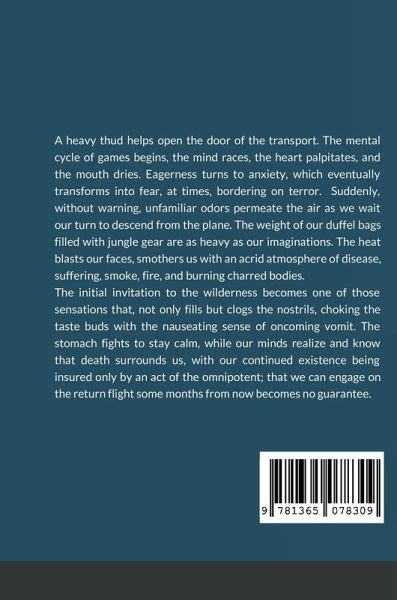A heavy thud helps open the door of the transport. The mental cycle of games begins, the mind races, the heart palpitates, and the mouth dries. Eagerness turns to anxiety, which eventually transforms into fear, at times, bordering on terror. Suddenly, without warning, unfamiliar odors permeate the air as we wait our turn to descend from the plane. The weight of our duffel bags filled with jungle gear are as heavy as our imaginations. The heat blasts our faces, smothers us with an acrid atmosphere of disease, suffering, smoke, fire, and burning charred bodies. The initial invitation to the wilderness becomes one of those sensations that, not only fills but clogs the nostrils, choking the taste buds with the nauseating sense of oncoming vomit. The stomach fights to stay calm, while our minds realize and know that death surrounds us, with our continued existence being insured only by an act of the omnipotent; that we can engage on the return flight some months from now becomes no guarantee.