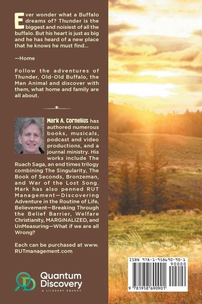 Ever wonder what a Buffalo dreams of? Thunder is the biggest and noisiest of all the buffalo. But his heart is just as big and he has heard of a new place that he knows he must find... -Home Follow the adventures of Thunder, Old-Old Buffalo, the Man Animal and discover with them, what home and family are all about. Mark A. Cornelius has authored numerous books, musicals, podcast and video productions, and a journal ministry. His works include The Ruach Saga, an end times trilogy combining The Singularity, The Book of Seconds, Bronzeman, and War of the Lost Song. Mark has also penned RUT Management-Discovering Adventure in the Routine of Life, Believement-Breaking Through the Belief Barrier, Welfare Christianity, MARGiNALIZED, and UnMeasuring-What if we are all Wrong? Each can be purchased at www.RUTmanagement.com