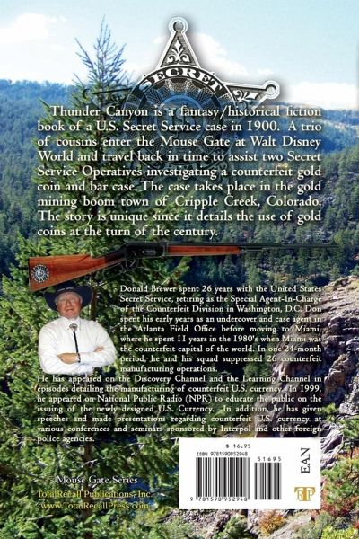 This book is unusual, since it deals with the counterfeiting of gold coins and gold bars circa 1900. Most Americans, outside of coin collectors, don't realize that gold coins were once a common form of currency in our country. In the book is a photo of a counterfeit gold coin detector, patented in 1857, that depicts spaces for 1 dollar, 2.5 dollar, 3 dollar, 5 dollar, 10 and 20 dollar gold coins. The book is set in 1900; Cripple Creek, Colorado, a gold "boom town." It details a Secret Service Investigation of a counterfeit gold coin and bar operation.
