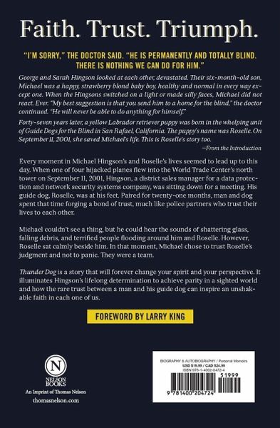 Thunder Dog is a story that will forever change your spirit and your perspective. It illuminates Hingsonâ s lifelong determination to achieve parity in a sighted world and how the rare trust between a man and his guide dog can inspire an unshakable faith in each one of us.
