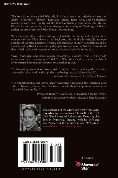 This isn't an ordinary Civil War tale. It is the all-true but little-known story of Adam "Stovepipe" Johnson-Kentucky legend, Texas hero, and Confederate cavalry officer-who boldly led the first Confederate raid across the Mason-Dixon Line to capture the thriving river-port community of Newburgh, Indiana, during the American Civil War. Not a shot was fired. With the politically divided landscape of Civil War Kentucky and the steamboat economy of the Ohio River as its backdrop, this is the historically accurate account of surprise nocturnal strikes, opportunistic military occupations, and a swashbuckling Rebel icon's daring daylight invasion into the Northern homeland that sealed the fate of western Kentucky for the remainder of the war. Vivid, thorough, and painstakingly researched, Thunder from a Clear Sky documents five critical weeks of 1862 Civil War history and shares the untold tale of one man's immeasurable impact on a nation at war. "A fascinating account of how a skilled former Indian fighter gathered a few Kentucky rebels and 'woke up' the slumbering Indiana Home Guard." -Evansville Courier & Press Book Reviews "An important and, until now, largely neglected story about the American Civil War... Thunder from a Clear Sky stands as a fresh and important contribution in a field long studied."-Professor Randy K. Mills, Ph.D., Oakland City University, author of Jonathan Jennings: Indiana's First Governor