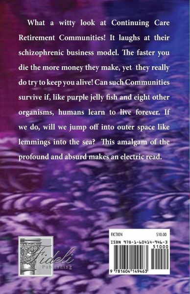What a witty look at Continuing Care Retirement Communities! It laughs at their schizophrenic business model. The faster you die the more money they make, yet they really do try to keep you alive! Can such Communities survive if, like purple jelly fish and eight other organisms, humans learn to live forever. If we do, will we jump off into outer space like lemmings into the sea? This amalgam of the profound and absurd makes an electric read.