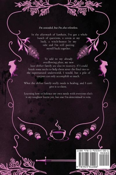 I'm wounded, but I'm also relentless. In the aftermath of Samhain, I've got a whole bunch of questions, a coven at my back, a witch-hunter by my side and I'm still putting myself back together. To add to my already overflowing plate, my new bear shifter family are also in recovery. If I could break some necks to help them sever the final ties to the supernatural underworld, I would, but a pile of corpses can only accomplish so much. What the shifter family really needs is healing, and I can't give it to them. Learning how to balance my own needs with everyone else's is my toughest battle yet, but one I'm determined to win.