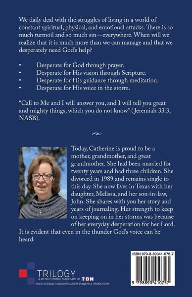 We daily deal with the struggles of living in a world of constant spiritual, physical, and emotional attacks. There is so much turmoil and so much sin-everywhere. When will we realize that it is much more than we can manage and that we desperately need God's help?Desperate for God through prayer. Desperate for His vision through Scripture. Desperate for His guidance through meditation. Desperate for His voice in the storm. "Call to Me and I will answer you, and I will tell you great and mighty things, which you do not know" ( Jeremiah 33:3, NASB).