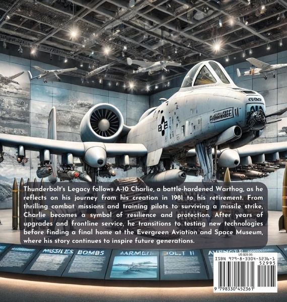 Thunderbolt's Legacy tells the captivating story of A-10 Charlie, a battle-tested Warthog who reflects on his long journey from creation to retirement. Built-in 1981 by Fairchild Republic, A-10 Charlie vividly recounts his first flight, the adrenaline of training new pilots, and the thrill of engaging in combat missions. From his powerful GAU-8 Avenger cannon to surviving a near-fatal missile strike in 1991, Charlie evolves into a symbol of resilience, protecting ground forces through countless battles. After years of service, including significant upgrades that enhance his precision and communication systems, Charlie transitions from frontline warfare to a quieter role testing advanced technologies. Now retired at the Evergreen Aviation and Space Museum, Charlie's story doesn't end with his last flight. As a museum exhibit, he inspires new generations with his legacy of courage, perseverance, and the enduring spirit of service.