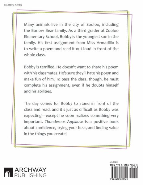 Many animals live in the city of Zooloo, including the Barlow Bear family. As a third grader at Zooloo Elementary School, Bobby is the youngest son in the family. His first assignment from Miss Armadillo is to write a poem and read it out loud in front of the whole class. Bobby is terrified. He doesn't want to share his poem with his classmates. He's sure they'll hate his poem and make fun of him. To pass the class, though, he must complete his assignment, even if he doubts himself and his abilities. The day comes for Bobby to stand in front of the class and read, and it's just as difficult as Bobby was expecting-except he soon realizes something very important. Thunderous Applause is a positive book about confidence, trying your best, and finding value in the things you create!
