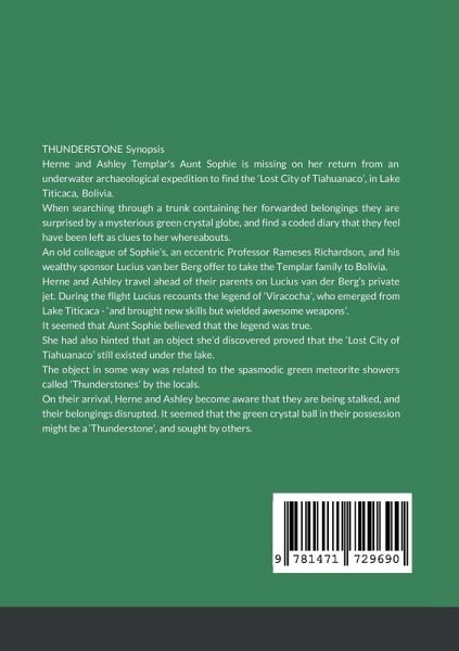 THUNDERSTONE Synopsis Herne and Ashley Templar's Aunt Sophie is missing on her return from an underwater archaeological expedition to find the 'Lost City of Tiahuanaco', in Lake Titicaca, Bolivia. When searching through a trunk containing her forwarded belongings they are surprised by a mysterious green crystal globe, and find a coded diary that they feel have been left as clues to her whereabouts. An old colleague of Sophie's, an eccentric Professor Rameses Richardson, and his wealthy sponsor Lucius van ber Berg offer to take the Templar family to Bolivia. Herne and Ashley travel ahead of their parents on Lucius van der Berg's private jet. During the flight Lucius recounts the legend of 'Viracocha', who emerged from Lake Titicaca - 'and brought new skills but wielded awesome weapons'. It seemed that Aunt Sophie believed that the legend was true. She had also hinted that an object she'd discovered proved that the 'Lost City of Tiahuanaco' still existed under the lake. The object in some way was related to the spasmodic green meteorite showers called 'Thunderstones' by the locals. On their arrival, Herne and Ashley become aware that they are being stalked, and their belongings disrupted. It seemed that the green crystal ball in their possession might be a 'Thunderstone', and sought by others.