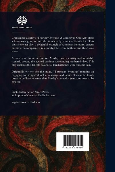 Christopher Morley's "Thursday Evening: A Comedy in One Act" offers a humorous glimpse into the timeless dynamics of family life. This classic one-act play, a delightful example of American literature, centers on the ever-complicated relationship between mothers and their sons' wives. A master of domestic humor, Morley crafts a witty and relatable scenario around the age-old tensions surrounding mothers-in-law. This play explores the delicate balance of familial bonds with comedic flair. Originally written for the stage, "Thursday Evening" remains an engaging and insightful look at marriage and family. This meticulously prepared edition ensures that Morley's comedic gem continues to be enjoyed. This work has been selected by scholars as being culturally important, and is part of the knowledge base of civilization as we know it. This work is in the public domain in the United States of America, and possibly other nations. Within the United States, you may freely copy and distribute this work, as no entity (individual or corporate) has a copyright on the body of the work. Scholars believe, and we concur, that this work is important enough to be preserved, reproduced, and made generally available to the public. We appreciate your support of the preservation process, and thank you for being an important part of keeping this knowledge alive and relevant.