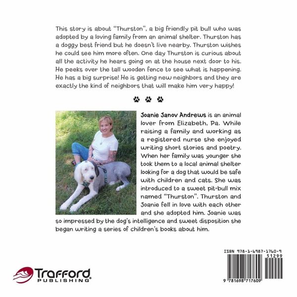 This story is about "Thurston", a big friendly pit bull who was adopted by a loving family from an animal shelter. Thurston has a doggy best friend but he doesn't live nearby. Thurston wishes he could see him more often. One day Thurston is curious about all the activity he hears going on at the house next door to his. He peeks over the tall wooden fence to see what is happening. He has a big surprise! He is getting new neighbors and they are exactly the kind of neighbors that will make him very happy!