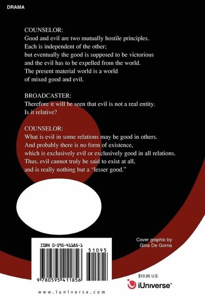 COUNSELOR: Good and evil are two mutually hostile principles. Each is independent of the other; but eventually the good is supposed to be victorious and the evil has to be expelled from the world. The present material world is a world of mixed good and evil. BROADCASTER: Therefore it will be seen that evil is not a real entity. Is it relative? COUNSELOR: What is evil in some relations may be good in others. And probably there is no form of existence, which is exclusively evil or exclusively good in all relations. Thus, evil cannot truly be said to exist at all, and is really nothing but a "lesser good."