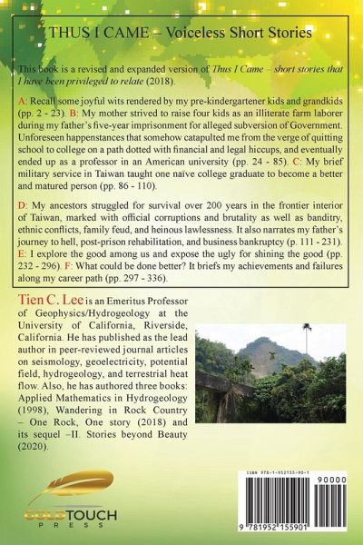 This book is a revised and expanded version of Thus I Came - short stories that I have been privileged to relate (2018).A: Recall some joyful wits rendered by my pre-kindergartener kids and grandkids (pp. 2 - 23). B: My mother strived to raise four kids as an illiterate farm laborer during my father's five-year imprisonment for alleged subversion of Government. Unforeseen happenstances that somehow catapulted me from the verge of quitting school to college on a path dotted with financial and legal hiccups, and eventually ended up as a professor in an American university (pp. 24 - 85). C: My brief military service in Taiwan taught one naïve college graduate to become a better and matured person (pp. 86 - 110).D: My ancestors struggled for survival over 200 years in the frontier interior of Taiwan, marked with official corruptions and brutality as well as banditry, ethnic conflicts, family feud, and heinous lawlessness. It also narrates my father's journey to hell, post-prison rehabilitation, and business bankruptcy (p. 111 - 231). E: I explore the good among us and expose the ugly for shining the good (pp. 232 - 296). F: What could be done better? It briefs my achievements and failures along my career path (pp. 297 - 336).