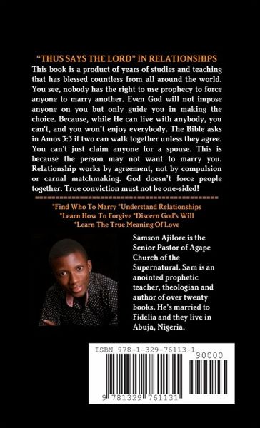 "THUS SAYS THE LORD" IN RELATIONSHIPS This book is a product of years of studies and teaching that has blessed countless from all around the world. You see, nobody has the right to use prophecy to force anyone to marry another. Even God will not impose anyone on you but only guide you in making the choice. Because, while He can live with anybody, you can't, and you won't enjoy everybody. The Bible asks in Amos 3:3 if two can walk together unless they agree. You can't just claim anyone for a spouse. This is because the person may not want to marry you. Relationship works by agreement, not by compulsion or carnal matchmaking. God doesn't force people together. True conviction must not be one-sided! ============================================= *Find Who To Marry *Understand Relationships *Learn How To Forgive *Discern God's Will *Learn The True Meaning Of Love