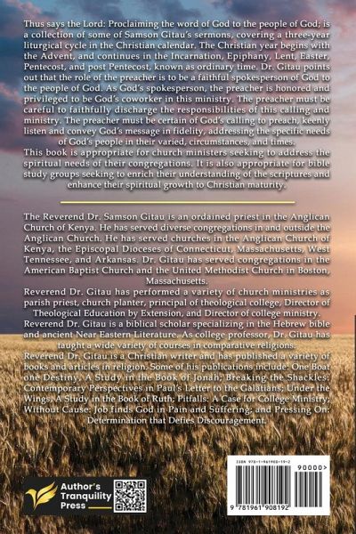 The Reverend Dr. Samson Gitau is an ordained priest in the Anglican Church of Kenya. He has served diverse congregations in and outside the Anglican Church. He served churches in the Anglican Church of Kenya, the Episcopal Dioceses of Connecticut, Massachusetts, West Tennessee, and Arkansas. Dr. Gitau has served congregations in the American Baptist Church and the United Methodist Church in Boston, Massachusetts. In addition to church ministry, Dr. Gitau is a biblical scholar specializing in the Hebrew Bible and ancient Near Eastern Literature. He has performed a variety of ministries as parish priest, principal of a theological college, Director of Theological Education by Extension, Director of the college ministry, and college professor, where he has taught a wide variety of courses in religion. Dr. Gitau is a Christian writer and has published a variety of books and articles. Some of his publications include One Boat One Destiny, A Study in the Book of Jonah; Breaking the Shackles: Contemporary Perspectives in Paul's Letter to the Galatians; Under the Wings, A Study in the Book of Ruth; Pitfalls: A Case for College Ministry; Without Cause: Job finds God in Pain and Suffering; and Pressing On: Determination that Defies Discouragement.