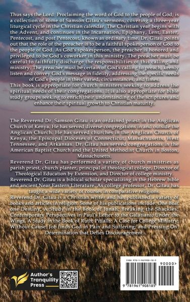 The Reverend Dr. Samson Gitau is an ordained priest in the Anglican Church of Kenya. He has served diverse congregations in and outside the Anglican Church. He served churches in the Anglican Church of Kenya, the Episcopal Dioceses of Connecticut, Massachusetts, West Tennessee, and Arkansas. Dr. Gitau has served congregations in the American Baptist Church and the United Methodist Church in Boston, Massachusetts. In addition to church ministry, Dr. Gitau is a biblical scholar specializing in the Hebrew Bible and ancient Near Eastern Literature. He has performed a variety of ministries as parish priest, principal of a theological college, Director of Theological Education by Extension, Director of the college ministry, and college professor, where he has taught a wide variety of courses in religion. Dr. Gitau is a Christian writer and has published a variety of books and articles. Some of his publications include One Boat One Destiny, A Study in the Book of Jonah; Breaking the Shackles: Contemporary Perspectives in Paul's Letter to the Galatians; Under the Wings, A Study in the Book of Ruth; Pitfalls: A Case for College Ministry; Without Cause: Job finds God in Pain and Suffering; and Pressing On: Determination that Defies Discouragement.