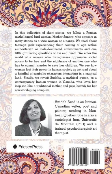 In this collection of short stories, we follow a Persian mythological bird woman, Mother Simorq, who appears in many stories as a wise woman or a nanny. We read about teenage girls experiencing their coming of age within authoritarian or male-dominated environments and one little girl facing questions of life and death. We enter the world of a woman who transgresses oppressive social norms to be free and the nightmare of another one who has to commit murder to save her children. We see how women lost their power in human society as we read about a handful of symbolic characters interacting in a magical land. Finally, we revisit Sudaba, a mythical queen, as a contemporary Iranian woman in Canada, who loves her step-son like a traditional mother and pays heavily for her son-worshiping complex.