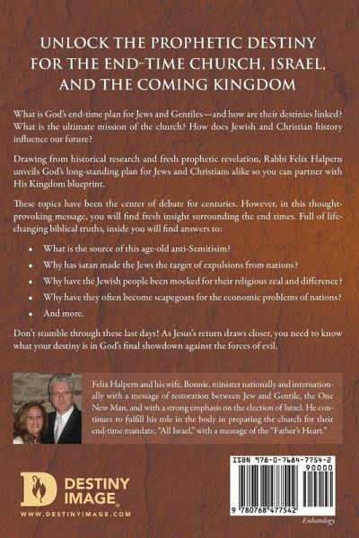 Unlock the Prophetic Destiny for the End-Time Church, Israel, and the Coming Kingdom What is God's end-time plan for Jews and Gentiles-and how are their destinies linked? What is the ultimate mission of the church? How does Jewish and Christian history influence our future? Drawing from historical research and fresh prophetic revelation, Rabbi Felix Halpern unveils God's long-standing plan for Jews and Christians alike so you can partner with His Kingdom blueprint. These topics have been the center of debate for centuries. However, in this thought-provoking message, you will find fresh insight surrounding the end times. Full of life-changing biblical truths, inside you will find answers to: What is the source of this age-old anti-Semitisim? Why has satan made the Jews the target of expulsions from nations? Why have the Jewish people been mocked for their religious zeal and difference? Why have they often become scapegoats for the economic problems of nations? And more. Don't stumble through these last days! As Jesus's return draws closer, you need to know what your destiny is in God's final showdown against the forces of evil.
