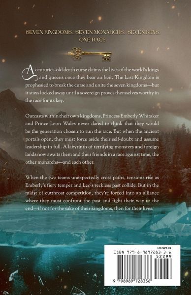 Seven kingdoms. Seven monarchs. Seven keys. One race. A centuries-old death curse claims the lives of the world's kings and queens once they bear an heir. The Last Kingdom is prophesied to break the curse and unite the seven kingdoms-but it stays locked away until a sovereign proves themselves worthy in the race for its key. Outcasts within their own kingdoms, Princess Emberly Whitaker and Prince Leon Wales never dared to think that they would be the generation chosen to run the race. But when the ancient portals open, they must force aside their self-doubt and assume leadership in full. A labyrinth of terrifying monsters and foreign lands now awaits them and their friends in a race against time, the other monarchs-and each other. When the two teams unexpectedly cross paths, tensions rise as Emberly's fiery temper and Leo's reckless past collide. But in the midst of cutthroat competition, they're forced into an alliance where they must confront the past and fight their way to the end-if not for the sake of their kingdoms, then for their lives.