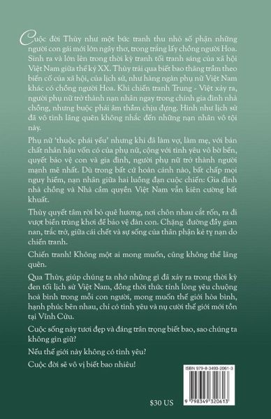 Cüc ¿¿i Thùy nh¿ m¿t b¿c tranh thu nh¿ s¿ ph¿n nh¿ng ng¿¿i con gái m¿i l¿n ngây th¿, trong tr¿ng l¿y ch¿ng ng¿¿i Hoa. Sinh ra và l¿n lên trong th¿i k¿ tranh t¿i tranh sáng c¿a xã h¿i Vi¿t Nam gi¿a th¿ k¿ XX. Thùy tr¿i qua bi¿t bao th¿ng tr¿m theo bi¿n c¿ c¿a xã h¿i, c¿a l¿ch s¿, nh¿ hàng ngàn ph¿ n¿ Vi¿t Nam khác có ch¿ng ng¿¿i Hoa. Khi chi¿n tranh Trung - Vi¿t x¿y ra, ng¿¿i ph¿ n¿ tr¿ thành n¿n nhân ngay trong chính gia ¿ình nhà ch¿ng, nh¿ng büc ph¿i âm th¿m ch¿u ¿¿ng. Hình nh¿ l¿ch s¿ ¿ã vô tình lãng quên không nh¿c ¿¿n nh¿ng n¿n nhân vô t¿i này. Ph¿ n¿ 'thüc phái y¿u' nh¿ng khi ¿ã làm v¿, làm m¿, v¿i b¿n ch¿t nhân h¿u v¿n có c¿a ph¿ n¿, c¿ng v¿i tình yêu vô b¿ b¿n, quy¿t b¿o v¿ con và gia ¿ình, ng¿¿i ph¿ n¿ tr¿ thành ng¿¿i m¿nh m¿ nh¿. Dù trong b¿t c¿ hoàn c¿nh nào, b¿t ch¿p m¿i nguy hi¿m, n¿n nhân gi¿a hai lüng ¿¿n cüc chi¿n: Gia ¿ình nhà ch¿ng và Nhà c¿m quy¿n Vi¿t Nam v¿n kiên c¿¿ng b¿t khüt. Thùy quy¿t tâm r¿i b¿ quê h¿¿ng, n¿i chôn nhau c¿t r¿n, ra ¿i v¿¿t bi¿n trùng kh¿i ¿¿ b¿o v¿ ¿àn con. Ch¿ng ¿¿¿ng ¿¿y gian nan, tr¿c tr¿, gi¿a cái ch¿t và s¿ s¿ng c¿a thân ph¿n k¿ t¿ n¿n do chi¿n tranh. Chi¿n tranh! Không m¿t ai mong mün, c¿ng không th¿ lãng quên. Qua Thùy, giúp chúng ta nh¿ nh¿ng gì ¿ã x¿y ra trong th¿i k¿ ¿en t¿i l¿ch s¿ Vi¿t Nam, ¿¿ng th¿i th¿c t¿nh lòng yêu chüng hoà bình trong m¿i con ng¿¿i, mong mün th¿ gi¿i hòa bình, h¿nh phúc bên nhau, ch¿ có tình yêu và n¿ c¿¿i th¿ gi¿i m¿i t¿n t¿i V¿nh C¿u. Cüc s¿ng này t¿¿i ¿¿p và ¿áng trân tr¿ng bi¿t bao, sao chúng ta không gìn gi¿? N¿u th¿ gi¿i này không có tình yêu? Cüc ¿¿i s¿ vô v¿ bi¿t bao nhiêu!
