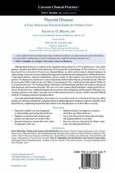Thyroid Disease: A Case-Based and Practical Guide for Primary Care, by Dr. Emanuel Brams, is a supremely readable cased-based approach to understanding the myriad of disorders that encompass thyroid disease. Using cases derived from his busy practice, Dr. Brams gives us the history and physical examination details of each case, along with test results. Then, through a series of questions similar to that which any good clinician asks while caring for a patient, Dr. Brams explains an optimal approach to diagnosis, treatment, and follow-up of thyroid disease, with an emphasis on the practical and common issues that primary care physicians see in their offices. This is an important book for primary care physicians because thyroid disease is common in the population we take care of and accounts for 3-5% of primary care visits. It is often cited as an area that primary care phy- cians find confusing. Dr. Brams clarifies thyroid disease and, through his generous sharing of cases, allowsus to join him in making clear diagnoses as well as share in the ambiguity and decisions about approach when the diagnoses and course of treatment are not clear. In this way, the book is honest, and deals directly with the issues of thyroid disease as they are seen by us as physicians, not as we sometimes may wish they were seen if patients presented with the clarity of walking textbooks. Dr.