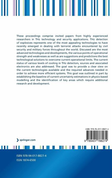 These proceedings comprise invited papers from highly experienced researchers in THz technology and security applications. THz detection of explosives represents one of the most appealing technologies to have recently emerged in dealing with terrorist attacks encountered by civil security and military forces throughout the world. Discussed are the most advanced technologies and developments, the various points of operational strength and weaknesses as well as are suggestions and predictions the best technological solutions to overcome current operational limits. The current status of various levels of cooling in THz detectors, sources and associated electronics are also addressed. The goal was to provide a clear view on the current technologies available and the required advances needed in order to achieve more efficient systems. This goal was outlined in part by establishing the baseline of current uncertainty estimations in physics-based modelling and the identification of key areas which require additional research and development.