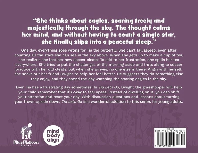 "She thinks about eagles, soaring freely and majestically through the sky. The thought calms her mind, and without having to count a single star, she finally slips into a peaceful sleep." One day, everything goes wrong for Tia the butterfly. She can't fall asleep, even after counting all the stars she can see in the sky above. When she gets up to make a cup of tea, she realizes she lost her new soccer cleats! To add to her frustration, she spills her tea everywhere. She tries to put the challenges of the morning aside and trots along to soccer practice with her old cleats, but when she arrives, no one else is there! Angry with herself, she seeks out her friend Dwight to help her feel better. He suggests they do something else they enjoy, and they spend the day watching the soaring eagles in the sky. Even Tia has a frustrating day sometimes! In Tia Lets Go, Dwight the grasshopper will help your child remember that it's okay to feel upset. Instead of dwelling on it, you can shift your attention and reset your day! With discussion questions and lessons about turning your frown upside down, Tia Lets Go is a wonderful addition to this series for young adults.
