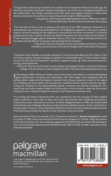"Though China's democracy movement was crushed in the Tiananmen Massacre 25 years ago, the ideas that animated it are eternal. Rowena Xiaoqing He, one of the most courageous academics in the U.S., has written a powerful book that tracks the poignant journeys of three exiled activists and honors the sacrifices so many Chinese had to make in 1989 and after." - Adi Ignatius, Wall Street Journal Beijing Bureau Chief in 1989 and co-editor of Prisoner of the State: The Secret Journal of Premier Zhao Ziyang