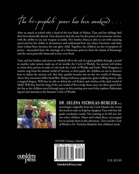 The tri-prophetsí power has been awakened . . . After an attack at school with a shard of the lost blade of Makea, Tiare and her siblings find their lives drastically altered. Tiare discovers that she now has the power of an awesome warrior, with the ability to use any weapon in battle. Her brother Mana is able to run with amazing speed and has the ability to deconstruct and understand how any object functions, and baby sister Leilani-Rose becomes the rare glow child. Together, the children are the tri-prophets of power-descended from the marriage of a Polynesian princess from the island of Rarotonga and the most powerful immortal to have ever lived. Tiare and her brother and sister are whisked off on the tail of a giant goldfish through a portal to another solar system made up of six worlds: the Circle of Worlds. An ancient evil wishes to claim their powers in order to rule both the Circle of Worlds and Earth. With Rangatira, a warrior stag from the animal world of Vaevae¿, as their guide, the children set out to discover how to defeat the ancient evil. But they quickly become lost on the tree world of Maunga, where they encounter killer butterflies, flying treehorses, pegacorns, giant walking insects, and a magical dragon. Will they be able to defeat the evil Kekete and witches of the dark world of Maki? Will they find the king of the sun world of R¿ to help them carry out their quest? Join the fun as the children travel through space in this exciting new novel that explores Polynesian legend and introduces the fantastic Circle of Worlds.