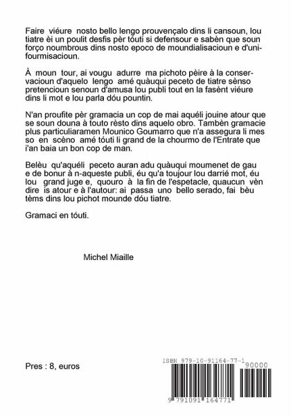 L'autour a vougu just adure un pau de joio e de bonur à n-aqueste publi amatour de tiatre prouvençau. Espèro tambèn que li legissèire auran autant de plesi à lire aquéli peceto qu'éu en a agu pèr lis escriéure.