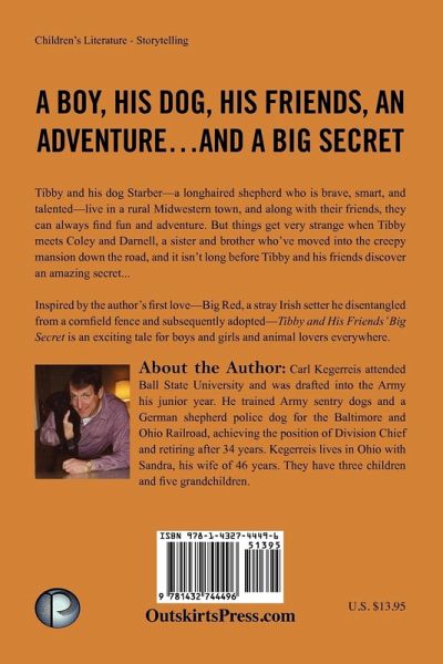 Wow, a great story for boys and girls and all animal lovers. Starber, a sandy white, long haired shepherd male dog, is talented, smart, brave, and his owner is Tibby. This story is about Tibby, Starber, Rex, and a school bully Fogel. Fogel and his friend's torment Tibby, Starber, and Rex. However, a weird incident occurs and Fogel becomes a close friend. Tibby and his friends meet a girl and her brother on a scary and exciting adventure. A big secret is revealed and they can't tell anyone. The reader is requested to keep the big secret. The Author wrote this story for his grandchildren. His granddaughter took the story to her 5th grade class. The teacher and the kids enjoyed it. This story was given to the Principal at a local grade school as a reading project. The Principal didn't know the Author or his family and enjoyed the story and the characters. The last page of this story requests the reader to use their imagination and on the following 5 blank pages draw and color the story characters, the mansion, the farmhouse, barn, and a cave. The readers are asked to compare their pictures with their friends, but keep the big secret.