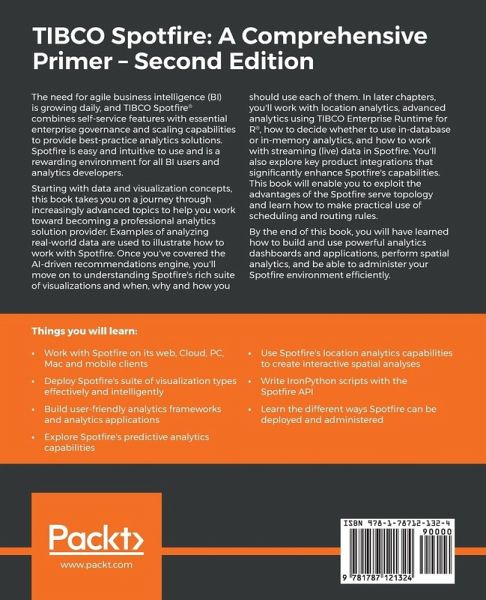 Create innovative informatics solutions with TIBCO Spotfire Key Features Get to grips with a variety of TIBCO Spotfire features to create professional applications Use different data and visualization techniques to build interactive analyses. Simplify BI processes and understand data analysis and visualization Book Description The need for agile business intelligence (BI) is growing daily, and TIBCO Spotfire® combines self-service features with essential enterprise governance and scaling capabilities to provide best-practice analytics solutions. Spotfire is easy and intuitive to use and is a rewarding environment for all BI users and analytics developers. Starting with data and visualization concepts, this book takes you on a journey through increasingly advanced topics to help you work toward becoming a professional analytics solution provider. Examples of analyzing real-world data are used to illustrate how to work with Spotfire. Once you've covered the AI-driven recommendations engine, you'll move on to understanding Spotfire's rich suite of visualizations and when, why and how you should use each of them. In later chapters, you'll work with location analytics, advanced analytics using TIBCO Enterprise Runtime for R®, how to decide whether to use in-database or in-memory analytics, and how to work with streaming (live) data in Spotfire. You'll also explore key product integrations that significantly enhance Spotfire's capabilities.This book will enable you to exploit the advantages of the Spotfire serve topology and learn how to make practical use of scheduling and routing rules. By the end of this book, you will have learned how to build and use powerful analytics dashboards and applications, perform spatial analytics, and be able to administer your Spotfire environment efficiently What you will learn Work with Spotfire on its web, Cloud, PC, Mac and mobile clients Deploy Spotfire's suite of visualization types effectively and intelligently Build user-friendly analytics frameworks and analytics applications Explore Spotfire's predictive analytics capabilities Use Spotfire's location analytics capabilities to create interactive spatial analyses Write IronPython scripts with the Spotfire API Learn the different ways Spotfire can be deployed and administered Who this book is for If you are a business intelligence or data professional, this book will give you a solid grounding in the use of TIBCO Spotfire. This book requires no prior knowledge of Spotfire or any basic data and visualization concepts.