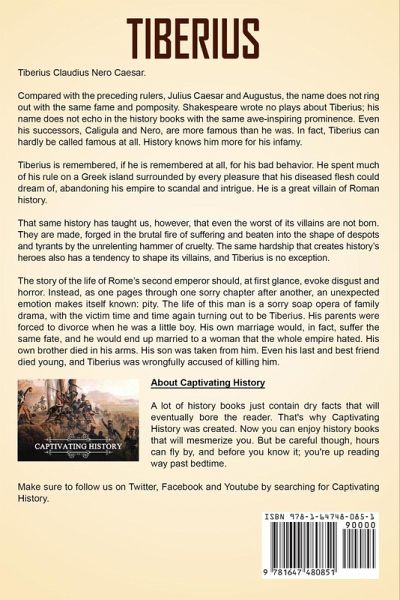If you want to discover the captivating life of Tiberius, then keep reading... Compared with the preceding rulers, Julius Caesar and Augustus, the name does not ring out with the same fame and pomposity. Shakespeare wrote no plays about Tiberius; his name does not echo in the history books with the same awe-inspiring prominence. Even his successors, Caligula and Nero, are more famous than he was. In fact, Tiberius can hardly be called famous at all. History knows him more for his infamy. Tiberius is remembered, if he is remembered at all, for his bad behavior. He spent much of his rule on a Greek island surrounded by every pleasure that his diseased flesh could dream of, abandoning his empire to scandal and intrigue. He is a great villain of Roman history. In Tiberius: A Captivating Guide to the Life of Ancient Rome’s Second Emperor and How He Ruled the Roman Empire, you will discover topics such as Before the Emperors Born into Turmoil The Eye of the Emperor In the Shadow of Augustus First Conquest Forced Marriage Rock Bottom Ascension A Slippery Slope to Capri The Last Javelin And much, much more! So if you want to learn more about Tiberius, scroll up and click the "add to cart" button!