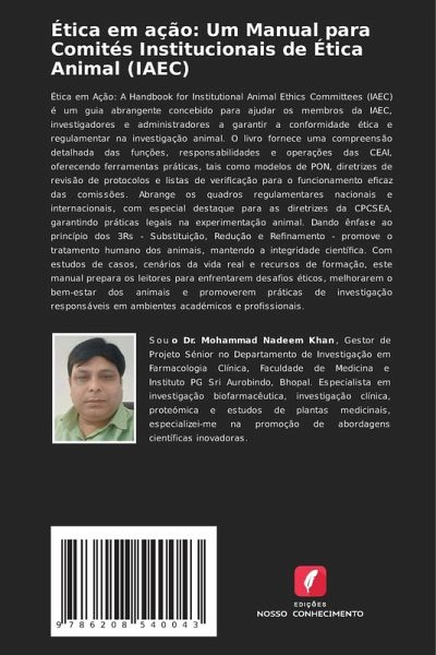 Ética em Ação: A Handbook for Institutional Animal Ethics Committees (IAEC) é um guia abrangente concebido para ajudar os membros da IAEC, investigadores e administradores a garantir a conformidade ética e regulamentar na investigação animal. O livro fornece uma compreensão detalhada das funções, responsabilidades e operações das CEAI, oferecendo ferramentas práticas, tais como modelos de PON, diretrizes de revisão de protocolos e listas de verificação para o funcionamento eficaz das comissões. Abrange os quadros regulamentares nacionais e internacionais, com especial destaque para as diretrizes da CPCSEA, garantindo práticas legais na experimentação animal. Dando ênfase ao princípio dos 3Rs - Substituição, Redução e Refinamento - promove o tratamento humano dos animais, mantendo a integridade científica. Com estudos de casos, cenários da vida real e recursos de formação, este manual prepara os leitores para enfrentarem desafios éticos, melhorarem o bem-estar dos animais e promoverem práticas de investigação responsáveis em ambientes académicos e profissionais.