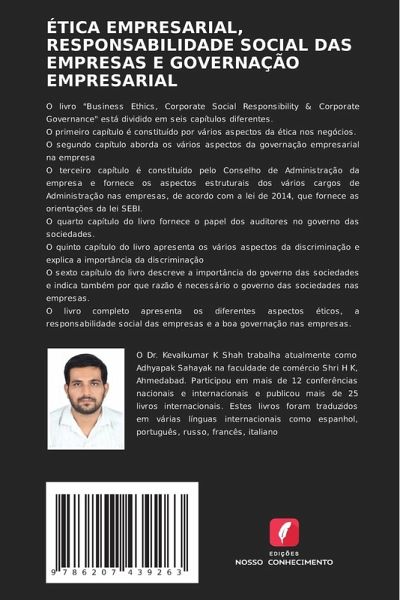 O livro "Business Ethics, Corporate Social Responsibility & Corporate Governance" está dividido em seis capítulos diferentes.O primeiro capítulo é constituído por vários aspectos da ética nos negócios.O segundo capítulo aborda os vários aspectos da governação empresarial na empresaO terceiro capítulo é constituído pelo Conselho de Administração da empresa e fornece os aspectos estruturais dos vários cargos de Administração nas empresas, de acordo com a lei de 2014, que fornece as orientações da lei SEBI.O quarto capítulo do livro fornece o papel dos auditores no governo das sociedades.O quinto capítulo do livro apresenta os vários aspectos da discriminação e explica a importância da discriminaçãoO sexto capítulo do livro descreve a importância do governo das sociedades e indica também por que razão é necessário o governo das sociedades nas empresas.O livro completo apresenta os diferentes aspectos éticos, a responsabilidade social das empresas e a boa governação nas empresas.