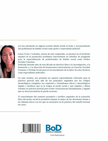 ¿Te has planteado en alguna ocasión dónde reside el éxito y reconocimiento del profesional de ámbito social como perito o especialista judicial? Laura Crous i Gonzàlez, autora de este compendio, es pionera en el territorio español en la promoción académica universitaria en estudios de postgrado para la especialización de profesionales de ámbito social como Peritos Sociales Forenses. Dedicada durante más de una década en ejercicio libre a la investigación, a la formación y a la dirección de formaciones universitarias en Ciencias Sociales Forenses y Peritaje Social para el reconocimiento de la labor de estos técnicos como especialistas judiciales. En esta ocasión, nos presenta un aspecto especialmente relevante para la práctica pericial más allá de los principios regulados por los códigos deontológicos colegiales: los requisitos y formalismos éticos y deontológicos legales y jurídicos que se le exigen al perito social y que regulan y deben orientar su práctica pericial para evitar consecuencias disciplinarias y legales que su desconocimiento le puede acarrear. El conocimiento del contexto normativo y jurídico regulador de la actuación ética del perito social le permitirá adoptar la mejor de las decisiones frente a los dilemas éticos con los que se encuentre en la práctica del estudio forense de casos.