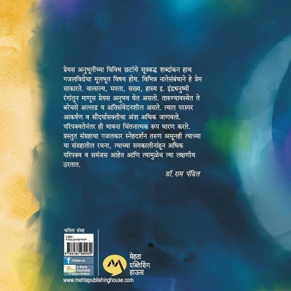 LOVE AND ITS EXPERIENCES AS A TOPIC ARE COMMON CHOICES OF GAZAL WRITERS, THE LOVE COMES FROM DIFFERENT RELATIONS LIKE LOVE FOR MOTHER, GIRLFRIEND, FRIENDS ETC.DURING THE PHASE OF MATURITY PERSON EXPERIENCES THE RAINBOW OF TRUE LOVE COLOURS. IN CHILDHOOD LOVE REMAINS IMMATURE AND SENSITIVE BUT AS THE PERSON GROWS UP IT TAKES UP THE SHAPE OF PROPER BEAUTY.THE GAZALAKAR OF ABOVE BOOK IS YOUNG HOWEVER THE GAZALS OF HIS BOOKS ARE FAR MATURE AND BEAUTIFUL IN COMPARISON WITH HIS CONTEMPORARIES IN SAME FIELD. प्रेयस अनुभूतींच्या विविध छटांचे सूत्रबद्ध शब्दांकन हाच गजलविद्येेचा मूलभूत विषय होय. विभिन्न नाते संबंधाने हे प्रेम साकारते. वात्सल्य, ममता, सख्य, हास्यइ. इंद्रधनुष्यी रंगांतून माणूस प्रेयस अनुभव घेतअसतो. तारुण्यावस्थेत ते बरेचसे अल्लड वअतिसंवेदनशील असते. त्यात परस्परआकर्षण व सौंदर्यासक्तीचाअंशअधिक जाणवतो. परिपक्वतेनंतरही भावना चिंतनात्मकरूप धारण करते. प्रस्तुत संठाहाचा गजलकार स्नेहदर्शन तरुण असूनही त्याच्या या संग्रहातील रचना, त्याच्या समकालीनांहूनअधिक परिपक्व व समंजसआहेतआणि त्यामुळेच त्या लक्षणीय ठरतात.
