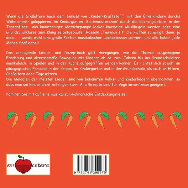 Wenn die Großeltern nach dem Genuss von Kinder-Kraftstoff mit den Enkeln durchs Wohnzimmer galoppieren, im Kindergarten Bratmonsterchen durch die Küche geistern, in der Tagespflege aus knautschiger Matschepampe lecker-knusprige Müslikugeln werden oder eine Grundschulklasse zum Klang selbstgebauter Rasseln "Tierisch fit" die Hüften schwingt, dann, ja dann... - wurde wohl eine große Portion musikalischer Leckerbissen serviert und alle haben jede Menge Spaß dabei!Ausgewogene Ernährung ist ein Thema, das uns alle angeht. Je früher im Leben gute Ernährungsgewohnheiten geprägt werden, desto selbstverständlicher werden gesundheitsförderliche Verhaltensweisen langfristig im persönlichen Alltag gelebt. Neben ausgewogener Ernährung gehört auch ein ausreichendes Maß an Bewegung zu einem gesundheitsförderlichen Lebensstil.Das vorliegende Lieder- und Rezeptbuch gibt Anregungen, wie die Themen ausgewogene Ernährung und altersgemäße Bewegung mit Kindern ab ca. zwei Jahren bis ins Grundschulalter musikalisch, in Spielen und in der Küche aufgegriffen werden können. Es richtet sich sowohl an pädagogisches Personal in der Krippe, im Kindergarten und in der Grundschule, als auch an Eltern, Großeltern oder Tageseltern. Die Melodien der meisten Lieder sind von bekannten Volks- und Kinderliedern übernommen, so dass man sie kinderleicht mitsingen kann. Alle Rezepte sind für Vegetarier/innen geeignet.Kommen Sie mit auf eine musikalisch-kulinarische Entdeckungsreise!InhaltsverzeichnisBevor es richtig losgeht... - Musikalische SchaumpartyWische, wasche, Seifenzauber (Lied)Die ErnährungspyramideApfel-Karotten-Salat (Rezept)Ticke, Tacke, Törchen, das Häschen isst gern Möhrchen (Lied)Es kocht ein Ki-Ka-Kinderkoch (Lied)Einfache Musikinstrumente bauenKinderlein, kommt, kocht mit mir! (Lied)Das Bratapfel-SchlemmerliedBratigel/Bratmonsterchen (Rezept)Buntes Essen (Lied)Rot, rot, rot sind Kirschen und Tomaten (Lied)Kinder-Kraftstoff (Smoothie-Rezept)Selbstgemachte Götterspeise (Rezept)Praktische KüchenmathematikObst- und Gemüseparade (Gedicht)AbzählreimMüslikugeln (Rezept)Im Frühling mag ich Kräuter (Lied)Himbeerblitzeis (Rezept)Der Affe schüttelt die Kokosnuss (Lied)Spielanleitung für das Lied "Der Affe schüttelt die Kokosnuss"Tierisch fit (Lied)Ich möchte was trinken (Lied)Wer will durstige Kinder seh'n (Lied)Empfohlene tägliche WasserzufuhrGute DurstlöscherHopp, hopp, hopp, Kinder lauft Galopp (Lied)Hier finden Sie weiterführende Informationen