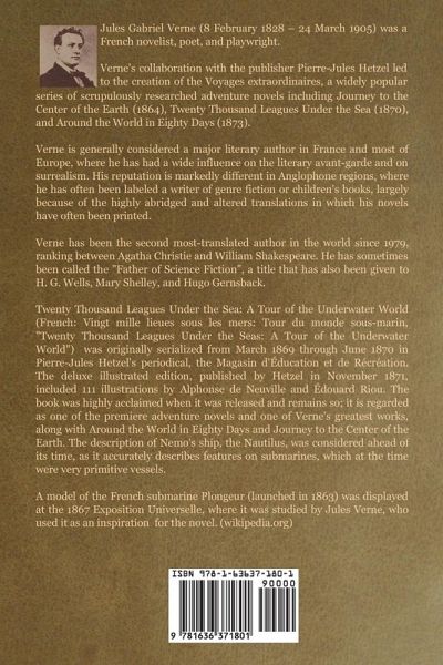 Jules Gabriel Verne (8 February 1828 - 24 March 1905) was a French novelist, poet, and playwright. Verne's collaboration with the publisher Pierre-Jules Hetzel led to the creation of the Voyages extraordinaires, a widely popular series of scrupulously researched adventure novels including Journey to the Center of the Earth (1864), Twenty Thousand Leagues Under the Sea (1870), and Around the World in Eighty Days (1873). Verne is generally considered a major literary author in France and most of Europe, where he has had a wide influence on the literary avant-garde and on surrealism. His reputation is markedly different in Anglophone regions, where he has often been labeled a writer of genre fiction or children's books, largely because of the highly abridged and altered translations in which his novels have often been printed. Verne has been the second most-translated author in the world since 1979, ranking between Agatha Christie and William Shakespeare. He has sometimes been called the "Father of Science Fiction", a title that has also been given to H. G. Wells, Mary Shelley, and Hugo Gernsback. Twenty Thousand Leagues Under the Sea: A Tour of the Underwater World (French: Vingt mille lieues sous les mers: Tour du monde sous-marin, "Twenty Thousand Leagues Under the Seas: A Tour of the Underwater World") was originally serialized from March 1869 through June 1870 in Pierre-Jules Hetzel's periodical, the Magasin d'Éducation et de Récréation. The deluxe illustrated edition, published by Hetzel in November 1871, included 111 illustrations by Alphonse de Neuville and Édouard Riou. The book was highly acclaimed when it was released and remains so; it is regarded as one of the premiere adventure novels and one of Verne's greatest works, along with Around the World in Eighty Days and Journey to the Center of the Earth. The description of Nemo's ship, the Nautilus, was considered ahead of its time, as it accurately describes features on submarines, which at the time were very primitive vessels. A model of the French submarine Plongeur (launched in 1863) was displayed at the 1867 Exposition Universelle, where it was studied by Jules Verne, who used it as an inspiration for the novel. (wikipedia.org)
