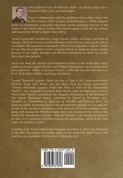 Jules Gabriel Verne (8 February 1828 - 24 March 1905) was a French novelist, poet, and playwright. Verne's collaboration with the publisher Pierre-Jules Hetzel led to the creation of the Voyages extraordinaires, a widely popular series of scrupulously researched adventure novels including Journey to the Center of the Earth (1864), Twenty Thousand Leagues Under the Sea (1870), and Around the World in Eighty Days (1873). Verne is generally considered a major literary author in France and most of Europe, where he has had a wide influence on the literary avant-garde and on surrealism. His reputation is markedly different in Anglophone regions, where he has often been labeled a writer of genre fiction or children's books, largely because of the highly abridged and altered translations in which his novels have often been printed. Verne has been the second most-translated author in the world since 1979, ranking between Agatha Christie and William Shakespeare. He has sometimes been called the "Father of Science Fiction", a title that has also been given to H. G. Wells, Mary Shelley, and Hugo Gernsback. Twenty Thousand Leagues Under the Sea: A Tour of the Underwater World (French: Vingt mille lieues sous les mers: Tour du monde sous-marin, "Twenty Thousand Leagues Under the Seas: A Tour of the Underwater World") was originally serialized from March 1869 through June 1870 in Pierre-Jules Hetzel's periodical, the Magasin d'Éducation et de Récréation. The deluxe illustrated edition, published by Hetzel in November 1871, included 111 illustrations by Alphonse de Neuville and Édouard Riou. The book was highly acclaimed when it was released and remains so; it is regarded as one of the premiere adventure novels and one of Verne's greatest works, along with Around the World in Eighty Days and Journey to the Center of the Earth. The description of Nemo's ship, the Nautilus, was considered ahead of its time, as it accurately describes features on submarines, which at the time were very primitive vessels. A model of the French submarine Plongeur (launched in 1863) was displayed at the 1867 Exposition Universelle, where it was studied by Jules Verne, who used it as an inspiration for the novel. (wikipedia.org)