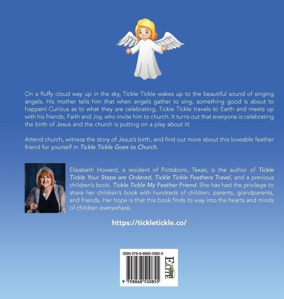 On a fluffy cloud way up in the sky, Tickle Tickle wakes up to the beautiful sound of singing angels. His mother tells him that when angels gather to sing, something good is about to happen! Curious as to what they are celebrating, Tickle Tickle travels to Earth and meets up with his friends, Faith and Joy, who invite him to church. It turns out that everyone is celebrating the birth of Jesus and the church is putting on a play about it! Attend church, witness the story of Jesus's birth, and find out more about this loveable feather friend for yourself in Tickle Tickle Goes to Church. Elizabeth Howard, a resident of Pottsboro, Texas, is the author of Tickle Tickle Your Steps are Ordered, Tickle Tickle Feathers Travel, and a previous children's book, Tickle Tickle My Feather Friend. She has had the privilege to share her children's book with hundreds of children, parents, grandparents, and friends. Her hope is that this book finds its way into the hearts and minds of children everywhere. https: //tickletickle.co
