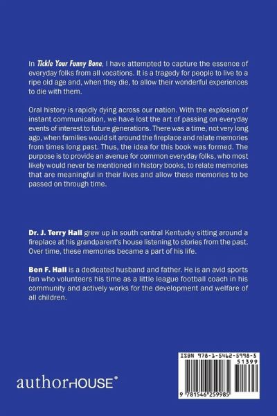In Tickle Your Funny Bone, I have attempted to capture the essence of everyday folks from all vocations. It is a tragedy for people to live to a ripe old age and, when they die, to allow their wonderful experiences to die with them. Oral history is rapidly dying across our nation. With the explosion of instant communication, we have lost the art of passing on everyday events of interest to future generations. There was a time, not very long ago, when families would sit around the fireplace and relate memories from times long past. Thus, the idea for this book was formed. The purpose is to provide an avenue for common everyday folks, who most likely would never be mentioned in history books, to relate memories that are meaningful in their lives and allow these memories to be passed on through time.