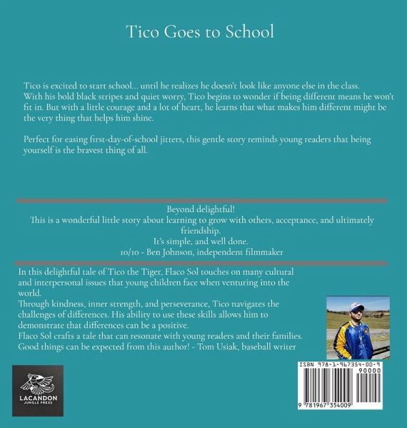 Tico's first day of school doesn't go exactly as planned... but it might be the beginning of something amazing. Tico Goes to School is a heartwarming first day of school book that helps children embrace what makes them unique. Tico, a young tiger cub, is excited and nervous as he walks into the classroom-until he realizes he doesn't look like the other kids. With his bold black stripes, he begins to wonder if being different means he won't fit in. Through gentle storytelling and rich, full-color illustrations, this jungle animal picture book explores big feelings in little hearts. Tico learns that bravery and self-confidence don't mean being perfect-they mean showing up, being yourself, and letting your stripes shine. This empowering children's book is perfect for:Preschool and kindergarten readers preparing for their first day Parents and teachers supporting social emotional learning for kids Families looking for friendship books for preschoolers Readers who enjoy tiger cub children's stories that teach empathy and courage Anyone searching for children's books about being different or books for anxious kids Includes a reflective diary page to help young readers process their own first-day experience. Great for ages 4-7 Book 1 in the Tico & Bruno series Help your child celebrate their uniqueness with a story full of heart, friendship, and stripes. Because sometimes, the bravest thing a kid can do... is be themselves.