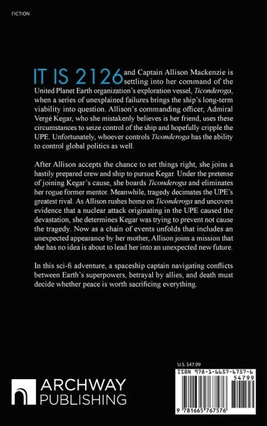 It is 2126 and Captain Allison Mackenzie is settling into her command of the United Planet Earth organization's exploration vessel, Ticonderoga, when a series of unexplained failures brings the ship's long-term viability into question. Allison's commanding officer, Admiral Vergé Kegar, who she mistakenly believes is her friend, uses these circumstances to seize control of the ship and hopefully cripple the UPE. Unfortunately, whoever controls Ticonderoga has the ability to control global politics as well. After Allison accepts the chance to set things right, she joins a hastily prepared crew and ship to pursue Kegar. Under the pretense of joining Kegar's cause, she boards Ticonderoga and eliminates her rogue former mentor. Meanwhile, tragedy decimates the UPE's greatest rival. As Allison rushes home on Ticonderoga and uncovers evidence that a nuclear attack originating in the UPE caused the devastation, she determines Kegar was trying to prevent not cause the tragedy. Now as a chain of events unfolds that includes an unexpected appearance by her mother, Allison joins a mission that she has no idea is about to lead her into an unexpected new future. In this sci-fi adventure, a spaceship captain navigating conflicts between Earth's superpowers, betrayal by allies, and death must decide whether peace is worth sacrificing everything.